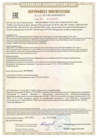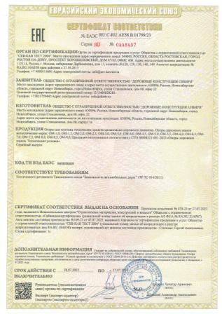 Сертификат соответствия требованиям "Безопасность автомобильных дорог" (ТР ТС 014/2011).Опоры для монтажа технических средств организации дорожного движения.